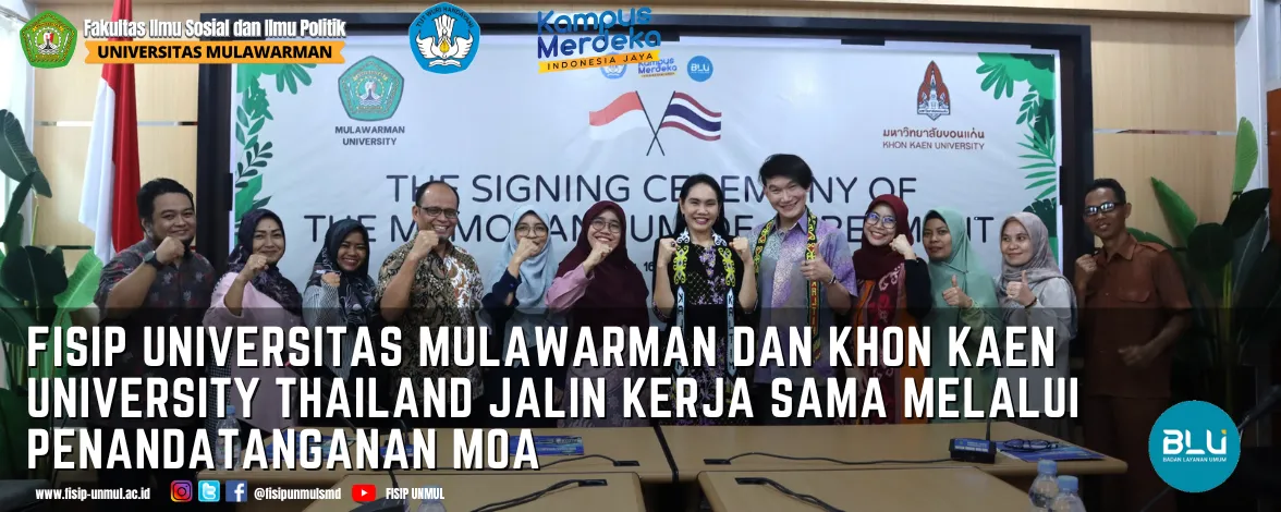 Kolaborasi lintas negara dalam bidang pendidikan dan riset semakin diperkuat melalui penandatanganan Memorandum of Agreement (MoA) antara Fakultas Ilmu Sosial dan Ilmu Politik (FISIP) Universitas Mulawarman dengan Faculty of Business Administration and Accountancy, Khon Kaen Business School, Khon Kaen University Thailand. Prosesi penandatanganan yang bersejarah ini disambut langsung oleh Dekan FISIP Universitas Mulawarman, Dr. Finnah Fourqoniah, M.Si, dan dipimpin oleh Assoc. Prof. Pensri Jaroenwanit (Ph.D), Dekan dari Khon Kaen Business School.