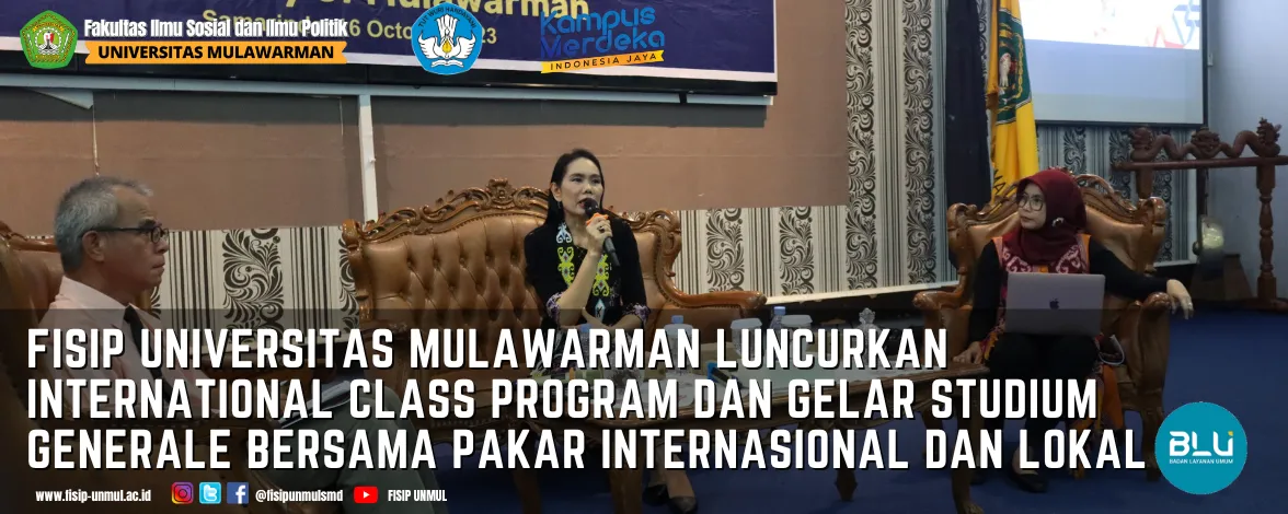 Fakultas Ilmu Sosial dan Ilmu Politik (FISIP) Universitas Mulawarman menggelar acara Studium Generale yang bertepatan dengan peluncuran International Class Program pada tanggal 16 Oktober 2023. Acara yang dihadiri oleh sejumlah akademisi, mahasiswa, dan stakeholder pendidikan ini menjadi momen bersejarah bagi FISIP UNMUL.