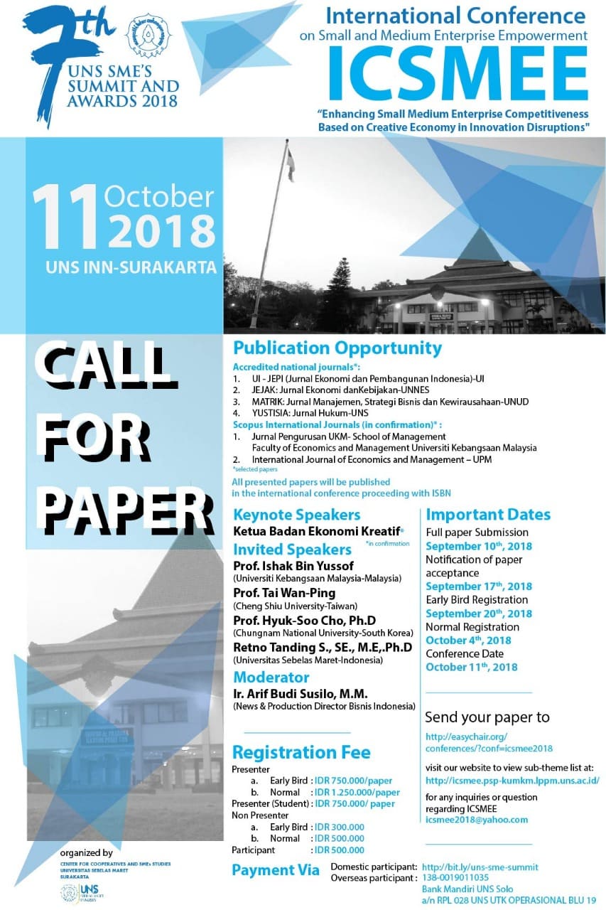 Information regarding the Seminar is listed on the poster (attached) and further information can be accessed in the website: http://icsmee.psp-kumkm.lppm.uns.ac.id/