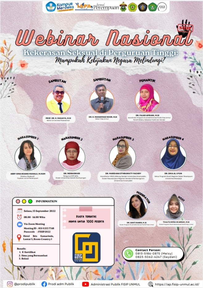 Maka dari itu, dalam rangka Dies Natalis Fisip Unmul ke 60 Tahun 2022, Program Studi Administrasi Publik Fisip Universitas menyelenggarakan Webinar Nasional Kekerasan Seksual di Perguruan Tinggi: Mampukah Kebijakan Negara Melindungi? pada Selasa, 13 September 2022 secara hybrid. Diawali dengan sambutan oleh Dekan Fisip Universitas Mulawarman, Dr. H. Muhammad Noor, M.Si. dan pembukaan acara secara resmi oleh Wakil Rektor III Bidang Kemahasiswaan dan Alumni, Dr. Encik Akhmad Syaifudin, MP, yang mewakili Rektor Universitas Mulawarman, webinar ini menghadirkan empat narasumber dengan kompetensi dan pengalaman kerja serta kajian yang sangat banyak tentang isu-isu perempuan dan gender. Diantaranya Abby Gina Boang Manalu, M.Hum yang merupakan Direktur Eksekutif Yayasan Jurnal Perempuan; Dr. Indraswari yang merupakan salah satu pengurus DPP Indonesian Association for Public Administration IAPA sekaligus dosen Universitas Katolik Parahyangan; Dr. Mardiana Ethrawaty Fachry yang merupakan Koordinator MDG's Bidang Gender sekaligus dosen Pascasarjana Magister Gender dan Pembangunan Universitas Hasanuddin; serta Dr. Dhia Al Uyun yang merupakan Ketua Program Studi Magister Kajian Perempuan Universitas Brawijaya. Webinar diawali dengan uraian dari Dr. Fajar Apriani, M.Si. (Koordinator Program Studi S1 Administrasi Publik Fisip Universitas Mulawarman) yang bertindak sebagai pemantik tentang pentingnya pencegahan dan penanganan kekerasan seksual di lingkungan perguruan tinggi.