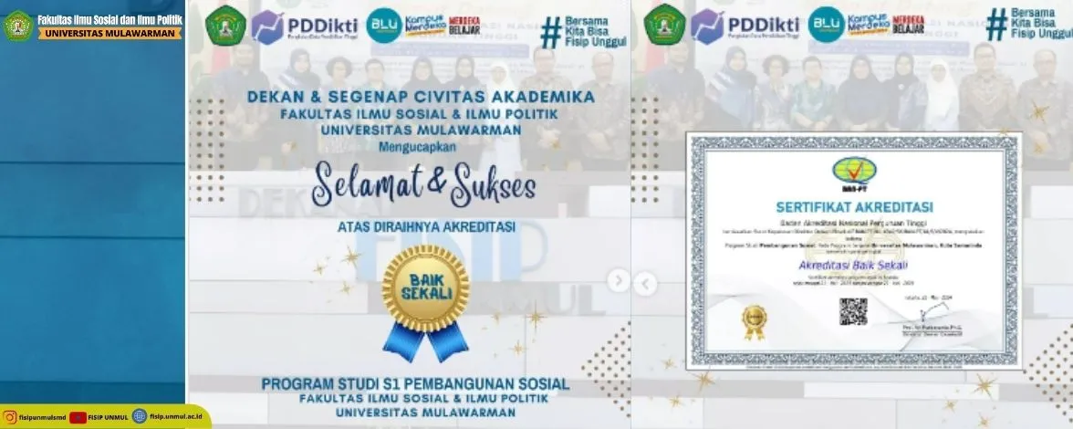 Dekan Seluruh Civitas Akademika Fakultas Ilmu Sosial dan Ilmu Politik Universitas Mulawarmanl mengucapkan Selamat dan Sukses kepada Prodi S1 Pembangunan Sosial telah meraih Akreditasi “BAIK SEKALI” oleh Badan Akreditasi Nasional Perguruan Tinggi berdasarkan Surat Keputusan Direktur Dewan Eksekutif BAN-PT 4342/SK/BAN-PT/Ak/S/V/2024