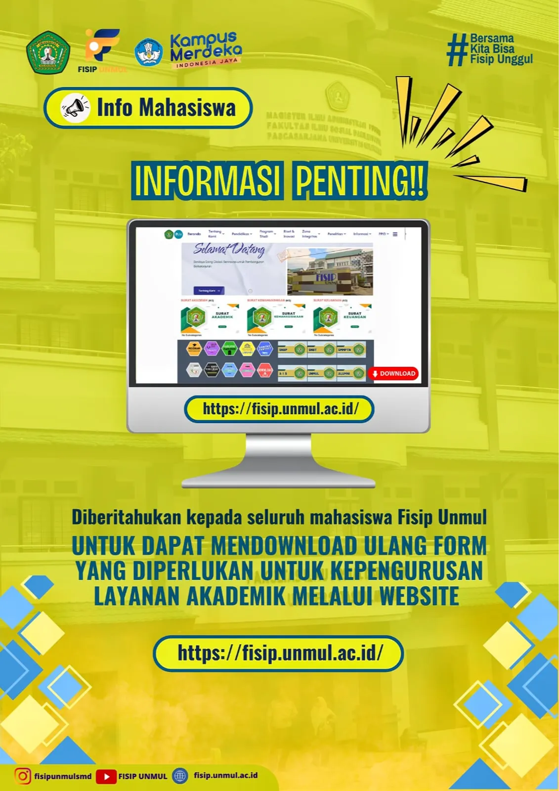 Diberitahukan kepada seluruh mahasiswa Fakultas Ilmu Sosial dan Ilmu Politik Universitas Mulawarman yang ingin mengurus surat menyurat dibidang Akademik dimohon untuk dapat Mendownload Ulang Form yang diperlukan ke website https://fisip.unmul.ac.id/