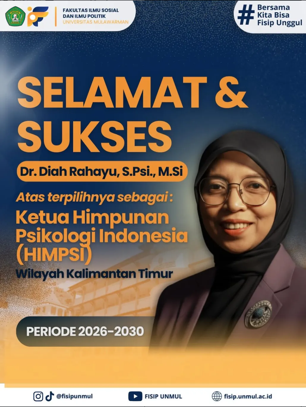 Keluarga Besar Fakultas Ilmu Sosial dan Ilmu Politik (FISIP) Universitas Mulawarman mengucapkan Selamat dan Sukses atas terpilihnya Dr. Diah Rahayu, S.Psi., M.Si sebagai Ketua Himpunan Psikologi Indonesia (HIMPSI) Wilayah Kalimantan Timur Periode 2026–2030.