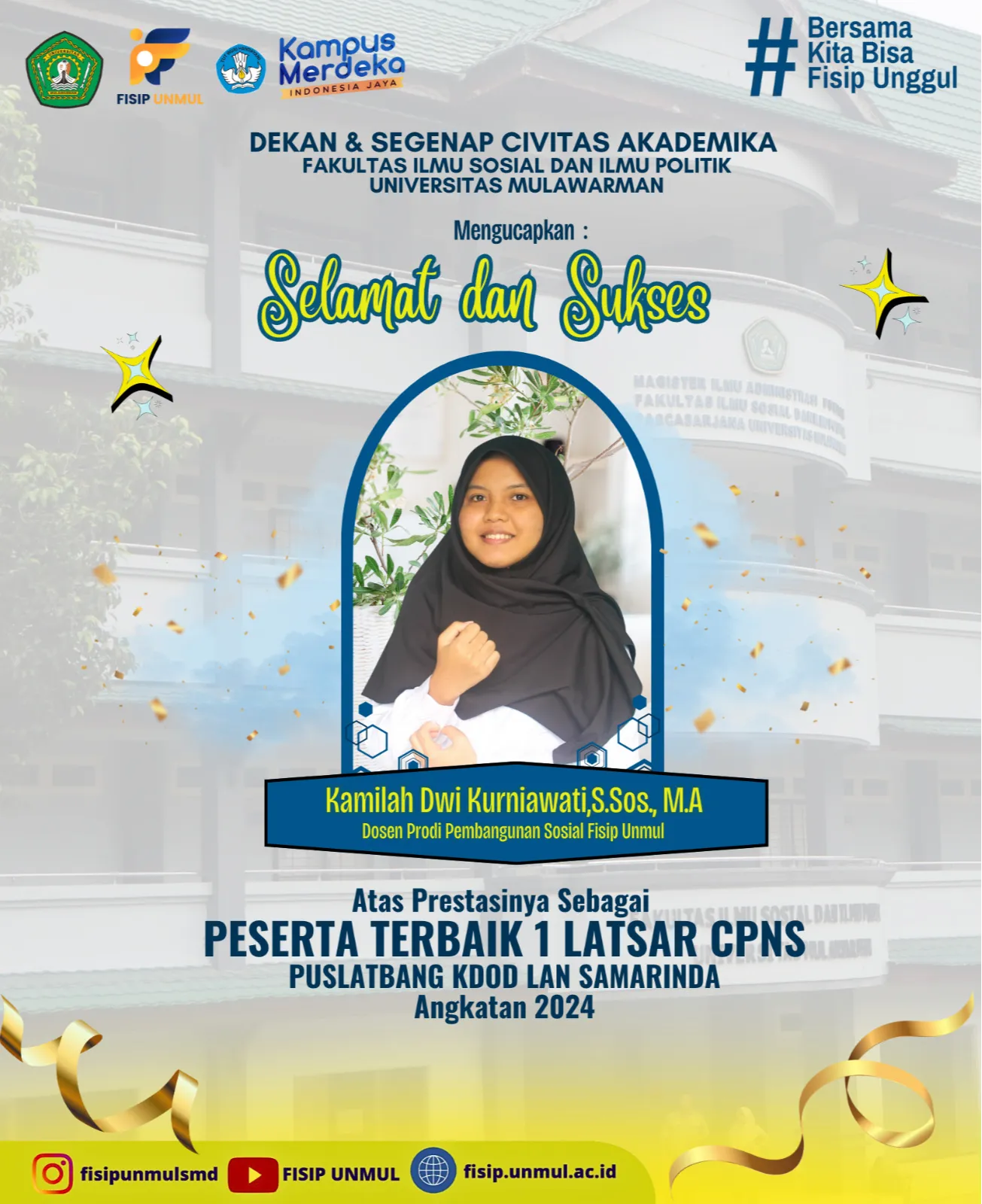 Selamat dan Sukses kepada Kamilah Dwi Kurniawati, S.Sos., M.A atas prestasinya sebagai peserta terbaik 1 latsar CPNS PUSLATBANG KDOD LAN Samarinda